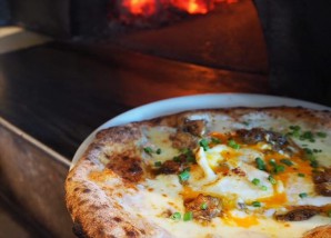 イタリア直輸入の大きな薪釜で焼かれたピザは、全粒粉の芳ばしい香りが味わい深く、“春よ恋”ならではのモチモチ感とパリッと感のバランスの良い生地に仕上がっています。
