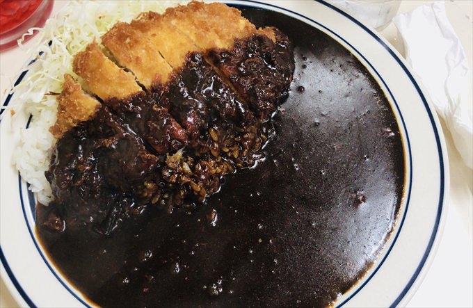 真っ黒なルーの見た目に驚きますが、さまざまな具材が溶け込んでとっても優しい味わいです。揚げたてサクサクの豚カツはボリュームたっぷりですよ。