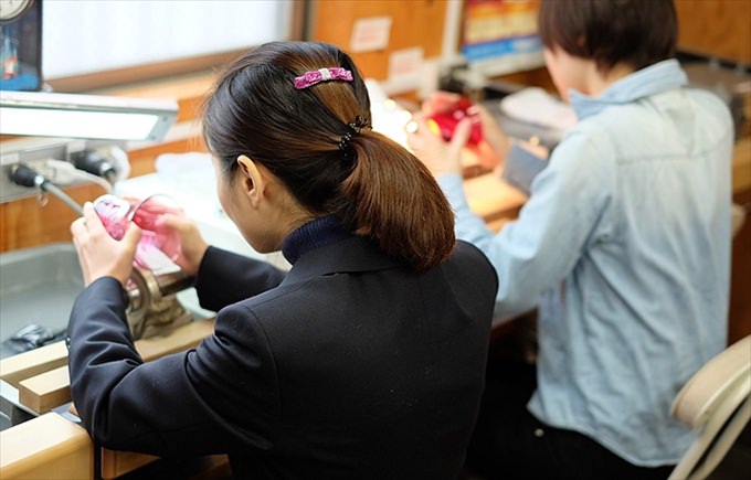 デートで訪れるからには、ぜひ江戸切子体験を。好きなグラスを選び、切子紋様を削って、オリジナルのグラスをつくることができます。職人さんが丁寧に教えてくれるので、不器用な人でも安心ですよ♪