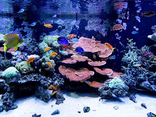 「ヨコハマおもしろ水族館」は中国南の島の小学校をモチーフにしたユニークな水族館。下駄箱や音楽室、体育館倉庫、校長室などに水槽が置かれていて、全400種類・約10,000匹の海の仲間たちに出会うことができる。