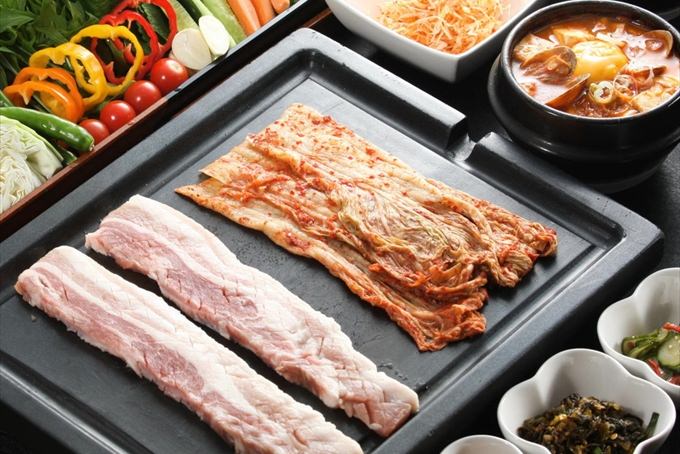 この店に来たからには頂きたいのが、豚の三枚肉を目の前の鉄板で焼くサムギョプサルと、数年前から韓国で流行しているフュージョン料理。フュージョン料理とは、チヂミやトッポギといった昔からある韓国料理に、チーズを乗せたりしてアレンジした料理のことを言います。