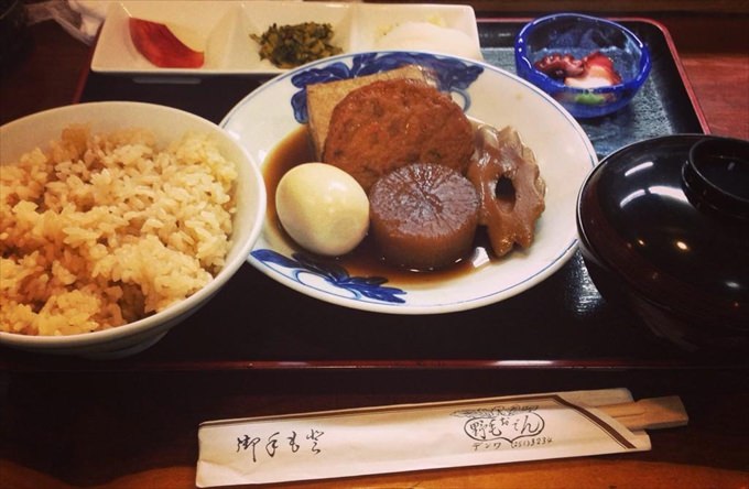 ランチはおでん定食や、焼き魚定食、刺身定食など数種類がありますが、やはりオススメはおでん定食。カウンターの向こうには、まっ黒な出汁の中にじっくりと染みたおでんが。