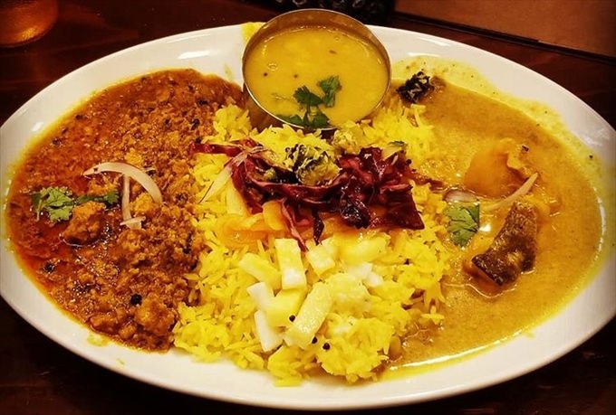 赤いピクルス、黄色いお米、2種類のカレーの盛り方がカラフルで、写真映えもします。カレーはシャバシャバ系が多い正統派のインドカレー。季節によって具の魚が変わるフィッシュカレーもおすすめです。