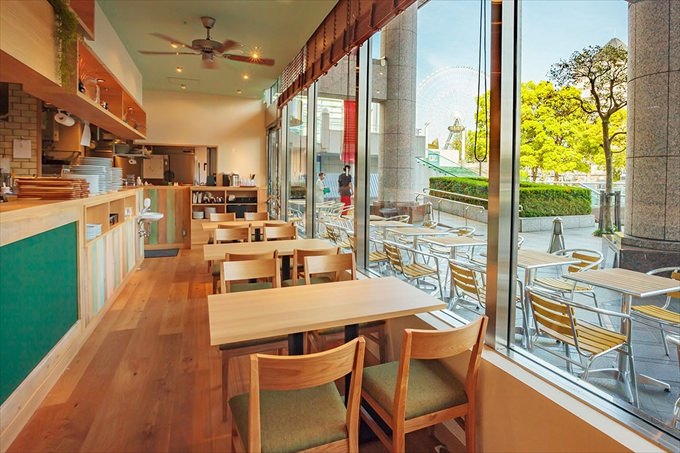 遊園地を目の前にしたテラス付きの店舗は開放的なロケーションです。