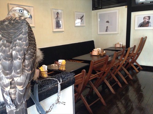 吉祥寺駅から井の頭公園を越えた先に、猛禽類たちの姿を眺めながらお茶ができる珍しいカフェがある。入口脇のウィンドウからも鷹たちの姿が見えるので、一目見ただけでもインパクト大の店構えだ。