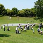 園内には、それぞれ趣が異なる2つの広場が広がる。緑の中にバスケットゴールが設置された「せせらぎ広場」と、石畳で少し落ち着いた風情の「中央広場」だ。ときおり野球場や武道館から聞こえてくる活気ある掛け声や歓声が、癒しとともに活力を与えてくれる。