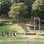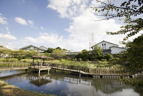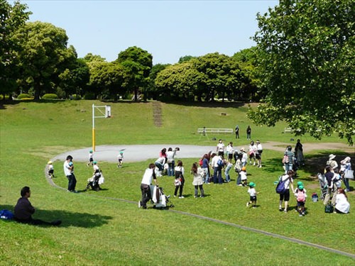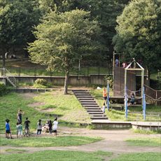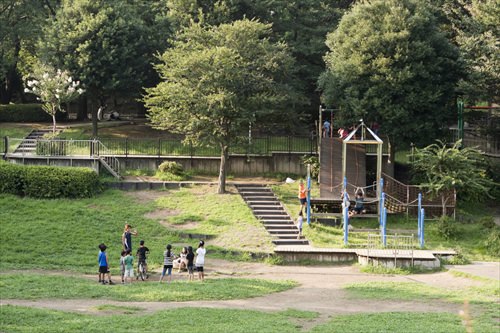 春には池を覆うように桜が咲き、知る人ぞ知る桜の名所として地元の方々に愛されている。池から小道を上がると、「忍者とりで」と呼ばれる遊具施設にたどり着き、週末ともなればローラーすべり台ではしゃぐ元気な子どもたちでにぎわう。