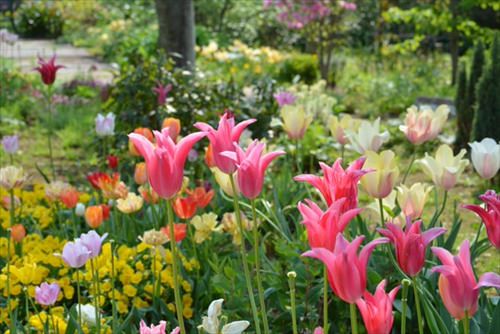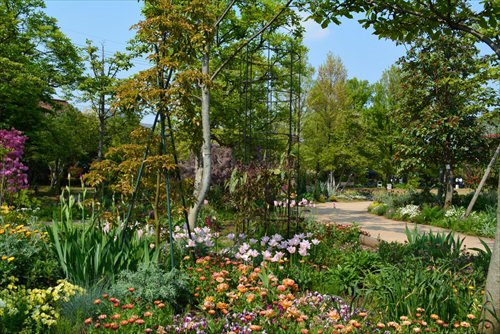 コンパクトにまとまった園内にはバラやハナミズキ、マグノリアといった色とりどりの花がそれぞれの季節に咲き誇るので非常に華やかだ。