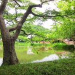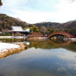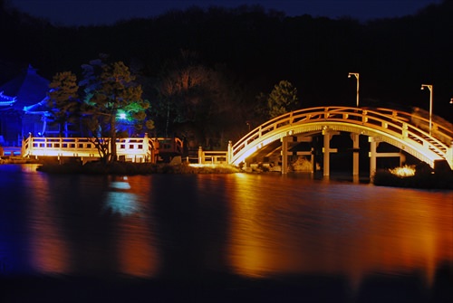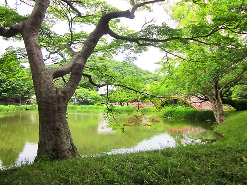 庭園の中心、阿字ヶ池のまわりには、樹齢800年を越えるといわれるイチョウの名木古木が並び、また池に映る赤い反橋や金堂が美しい。大型連休の時期にはライトアップも行われるのでぜひ足を運んでみたい。
