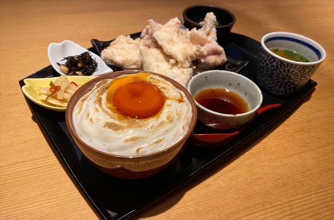 卵かけご飯は具材にしっかりと下味が付けられながらもとろける味わい。炙ったメレンゲがこんもりと盛り付けられている点も特徴。味も見た目もインパクトがあるので、ぜひ注文してみましょう。