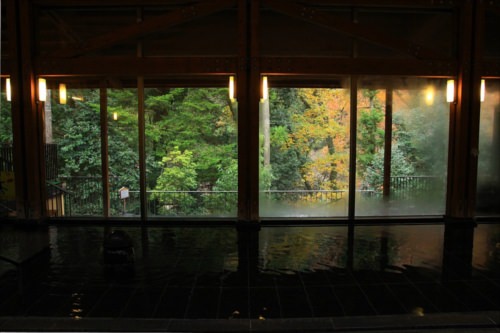 瀬音の湯は、秋川沿いにある宿泊も可能な温泉施設。渓谷沿いというロケーションを活かした、浴槽から大きな窓越しに見える景色は見事!四季折々の美しい表情を味わうことができる。