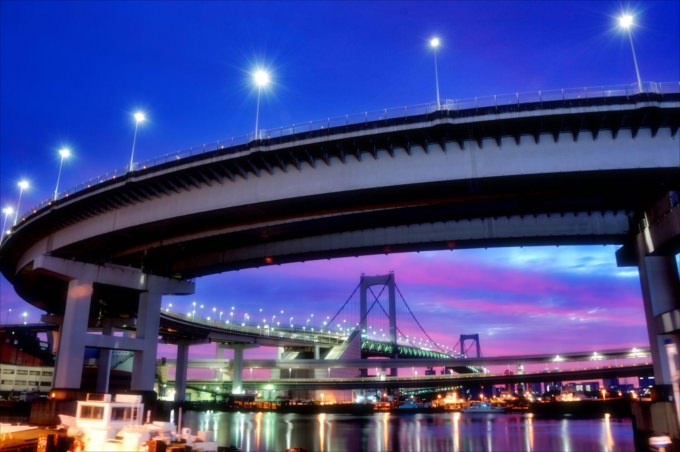 おすすめの時間帯は夜。橋にある街灯が特徴的で、江戸火消しのまといや庭園の灯ろうをイメージして作られたもの。幻想的な雰囲気が漂っています。この橋から見える夜景はとても美しく、カップルにとって定番の場所。