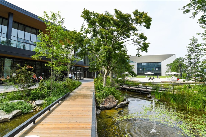 施設の外には広い芝生や池、水の流れる階段もあり、ゆったりとした心地よい空気が流れています。富士山が見えるスカイデッキもあり、周りを探索するだけでもリフレッシュできますよ。
