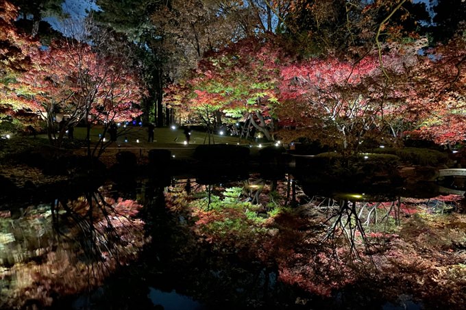 園内には、モミジやカエデが赤く染まる美しい世界が広がっています。夜にはライトアップされて、大人で幻想的な空間に。池の水面にも紅葉が映って、まるでアートのようですよ。