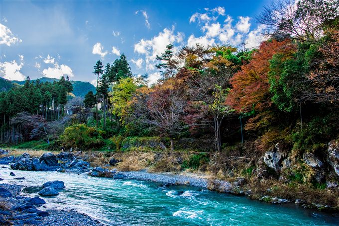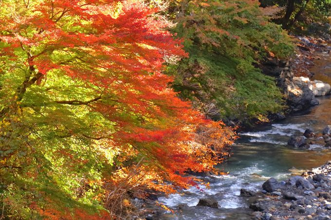 青梅市の多摩川近くにある東京を代表する紅葉の名所。優しく流れる川の心地よいせせらぎを聞きながら、真っ赤に染まる木々を楽しめます。