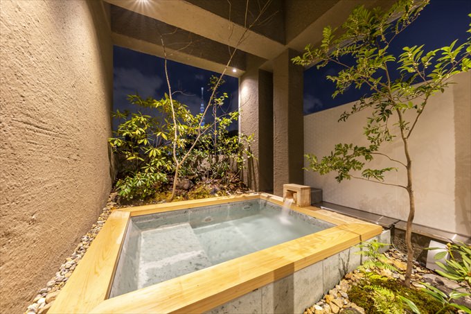 部屋はコンパクトで落ち着けるタイプや露天風呂付き、二間のゆったりとしたタイプをラインナップ。最上階の露天風呂は45分貸切ができて、東京スカイツリーを眺められる点も嬉しいポイントです。