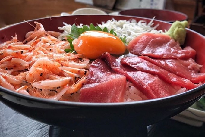 特におすすめなのは、板前がその場でおろす本マグロ。この本マグロと共に桜エビ・しらすをたっぷり乗せた三食丼が、ランチタイムの一番人気です。