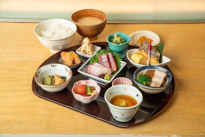 ランチの大人気メニューは、10種の京のおばんざい御膳。見た目も味わいも洗練されたおばんざいと、新鮮な刺身もセットで大満足!ご飯と白味噌汁はおかわりできるので、よく食べる方も満足できますよ。