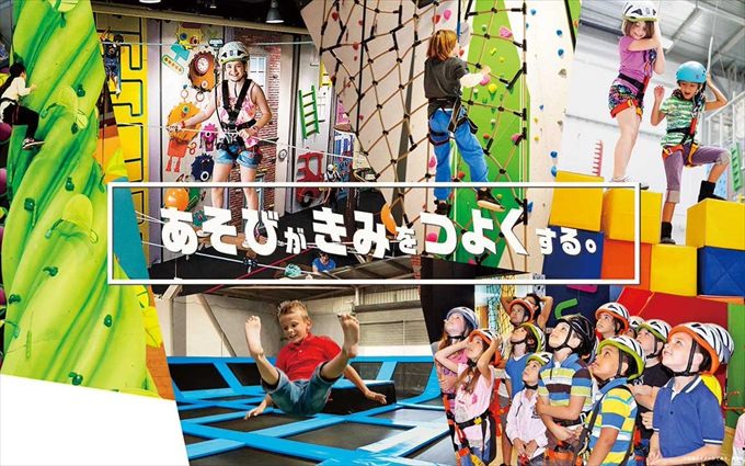 約480坪の施設内にはアクティビティがずらり。スリル満点のロープアクティビティや気軽に楽しめるクライミングウォールエリア、国内最大級のトランポリンエリアなどがあります。