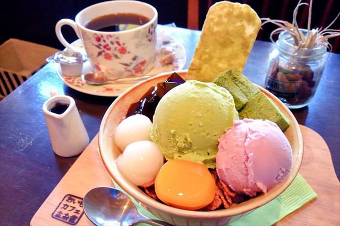 でも行列ができている大人気の甘味処。鎌倉駅から10分ほどの静かな住宅街の中にあります。人気のメニューは「宇治白玉クリームあんみつ」。