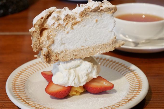 下からベリー、生クリーム、スポンジケーキ、と重ねられていて、まさに順番が逆さま。ぜひこの不安定な姿を写真におさめてくださいね。ユニークですが、味は本格的で美味しいですよ!
