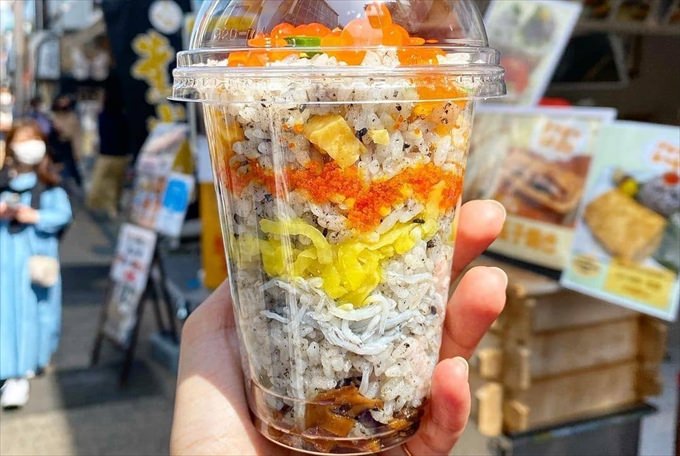 ロールいなり専門店で、名物の「しらすといくらのミルフィーユ」で有名です。食べ歩きできるの?と思うかもしれませんが、カップに入っているので手を汚さずに食べることができます。