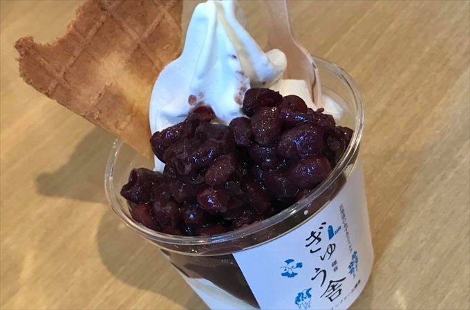 お店人気ナンバーワンは「お小豆さんソフトクリーム」。しぼりたてミルクをそのままアイスにしたようなクリーミーなソフトクリームに、北海道産小豆とアクセントにクッキーが添えられています。