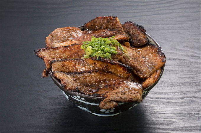 一番人気はロース肉とバラ肉のMIX丼。炭火でじっくり焼かれたロース肉が3つ、バラ肉が2つ、ご飯の上に載っています。