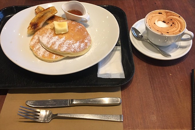 リコッタチーズ入りのパンケーキに添えられているのは、キャラメリゼしたバナナとバター、メープルシロップのみとシンプル。美味しいコーヒーと共に頂きたい一品です。