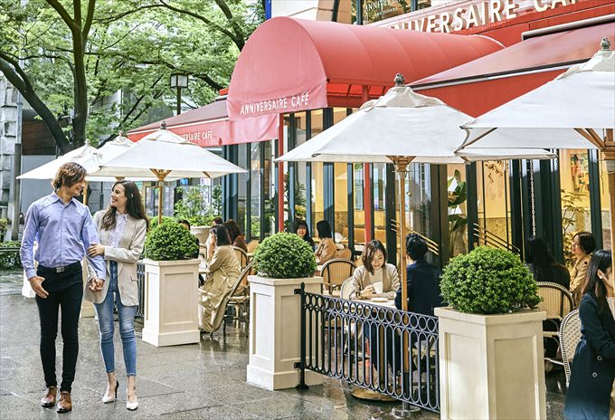 表参道のメインストリート、並木道の緑に映える赤い屋根が印象的なカフェレストラン。パリの街角を彷彿とさせるテラス席が目を引きます。