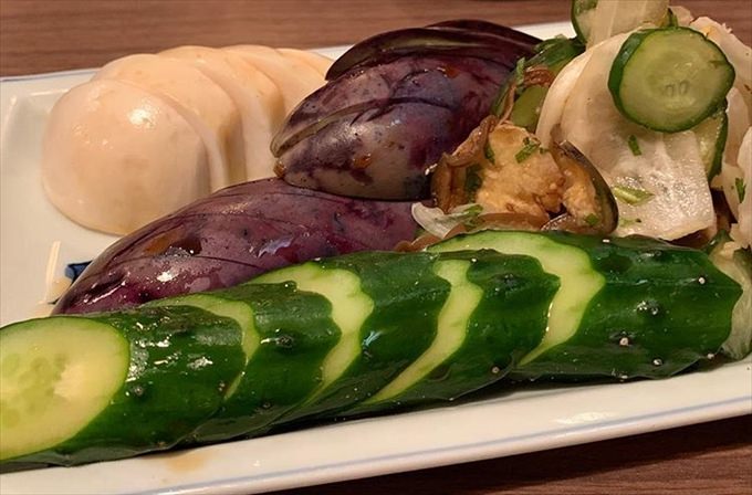 旬の野菜を焼き上げた串も見逃せません。合間には、大きめにカットされた浅漬けの【上新香】もいいものです。