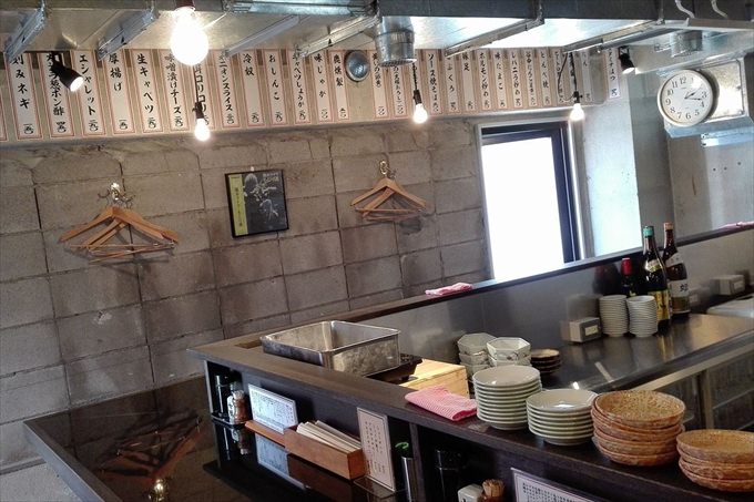 縄のれんをくぐって店内に入ると、そこは昭和の風情を色濃く残した空間で、調理場を囲むカウンターが主体、テーブルは2卓あります。