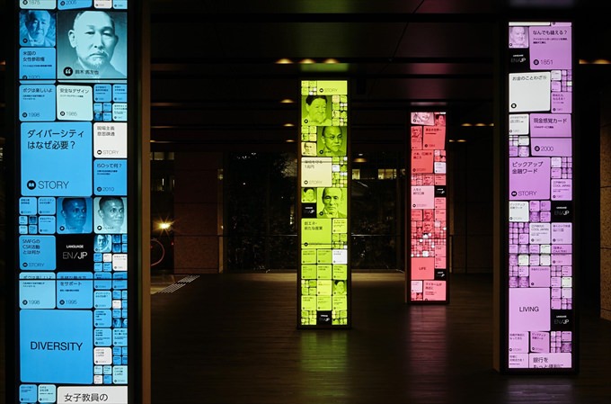三井住友銀行の体験型企業ミュージアム。空間の中に立つ8本の柱には、お金・金融にまつわる偉人が残した格言が表示されていて、いまの生活にも役立つ金言ばかりです。