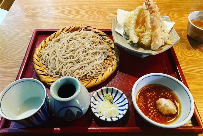 和風の蕎麦はもちろんのこと、香り豊かな「黒カレー蕎麦」もおすすめの一品!他にも蕎麦にあう天ぷらの盛り合わせは一種につき2品あるので2人で仲良く取り分けることもできますよ。