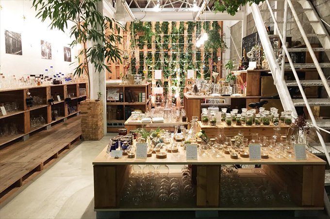 店内は理科の実験室を彷彿とさせる空間で、試験管の一輪挿しやフラスコの花瓶、アンティークな照明など、おしゃれなインテリア雑貨がバラエティ豊かに販売されています。