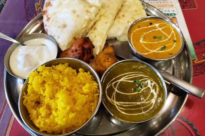人気のAセットはカレー2品・ナン・ミニライス・タンドリーチキン・サラダ・ソフトドリンクと充実した内容。カレーの辛さを調節できるのも嬉しいポイントです。