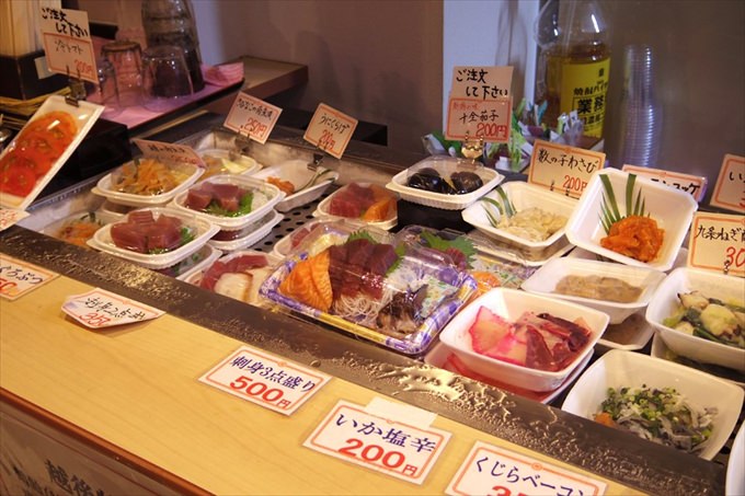 新鮮な魚が自慢で、食べやすいように加工された鮮魚がパック詰めされていて、客は好きなパックを取って酒の肴にします。でも、パック詰めなんてスーパーみたいですよね。