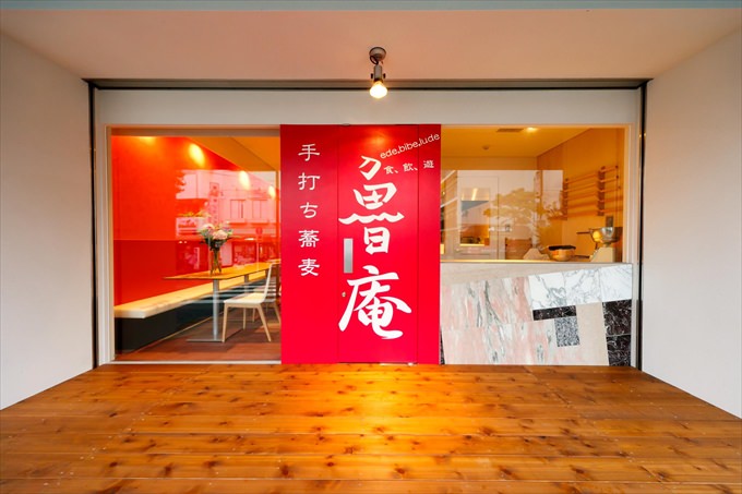 お蕎麦屋さんと思えないおしゃれでモダンなカラーリング。BAR感覚の雰囲気もありデートにおすすめの一軒です。