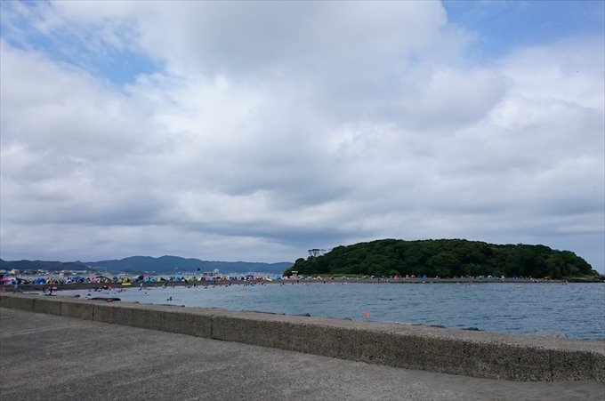 穏やかな波が特徴の海水浴場です。なんと陸から沖ノ島までを繋ぐ砂浜が海水浴場になっていて、その両側に海があります。とても珍しい海水浴場ですね。海は遠浅なので、泳ぐのが苦手なカップルでも安心ですよ。