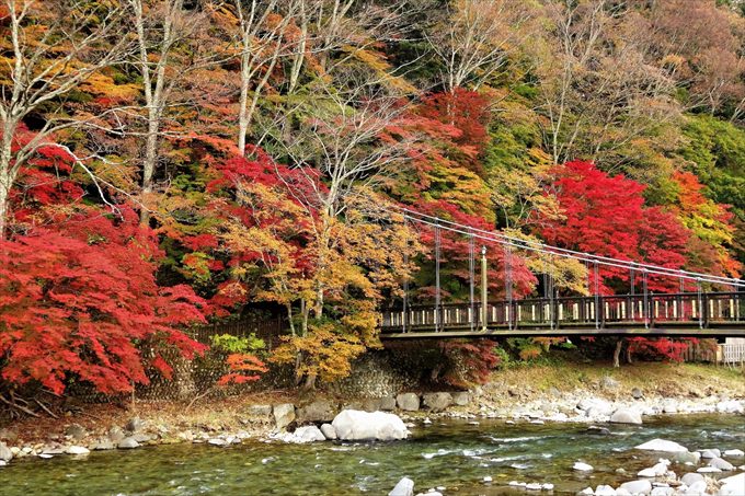 塩原温泉街の中ほどに位置する、箒川をまたぐ吊橋「紅の吊橋」。塩原に数ある紅葉の名所の中でも人気のスポットです。その名前の通り、鮮やかに染まる紅の光景は圧巻!息をのむほどの美しさです。