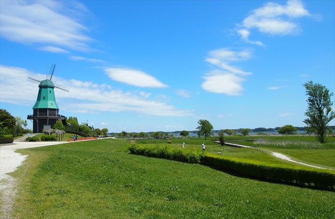 公園のシンボル、オランダ風車の展望台からは、霞ヶ浦はもちろん360度のパノラマを見渡すことが可能。たくさんの花が植えられていて、季節ごとに違った姿を見せてくれるため、いつ行っても楽しむことができますよ。