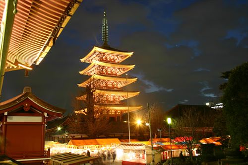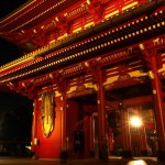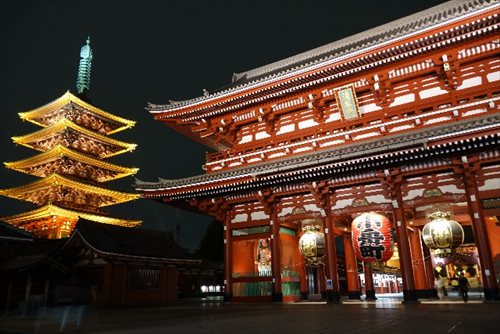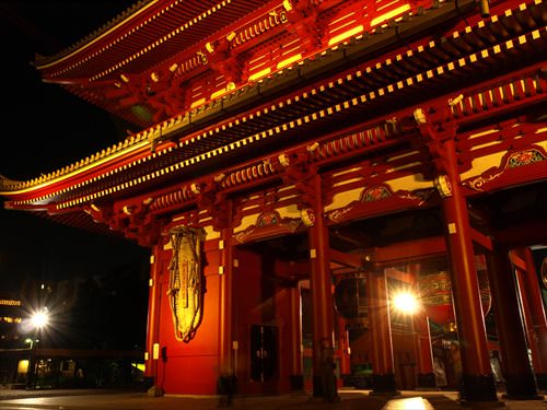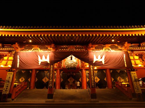 浅草寺は日没から夜11時まで、本堂、五重塔、宝蔵門、雷門のライトアップを行っている。夜になると日中の人ごみが嘘のようにまばらになり、幻想的な雰囲気に。鮮やかに浮かび上がる神々しい姿を拝みながら夜の浅草散策が楽しめる。