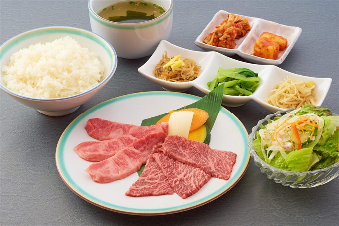 焼き立てを頬張れば、たちまち幸せな笑顔に。ごはんは一杯おかわり無料、食後にはコーヒーかシャーベット付き、とサービス満点です。おなかいっぱい美味しい焼肉を堪能できますよ。