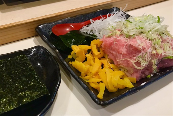 たくさんの薬味やわかめ、たくあんと一緒に豪快に盛ったねぎとろを、海苔で巻いていただくのがこのお店ならではの食べ方。お酒のつまみにもぴったりなので、たまには昼飲みで贅沢しちゃいましょう!