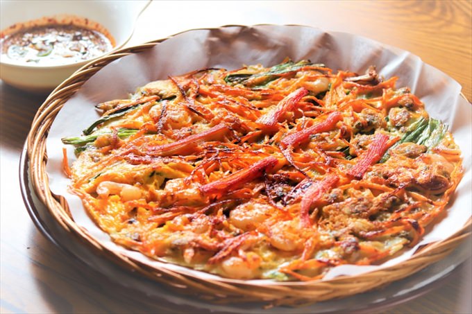常連さんたちから絶大の支持を誇るのが、海鮮チヂミ。玉子をたっぷり使ったふわふわの生地に、たくさんの海鮮と韓国産のネギが詰まったお店自慢のチヂミを特製だれに付けていただきます。
