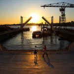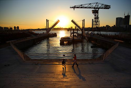 店内を満喫した後は中庭へ。水上バス乗り場付近に、背もたれが落ちたベンチが備えられているので、2人で寝そべりながらのんびりしよう。日が暮れると、中庭にある高さ25mのクレーンが色鮮やかにライトアップされ、対岸の高層ビル群とともに美しい夜景が楽しめる。