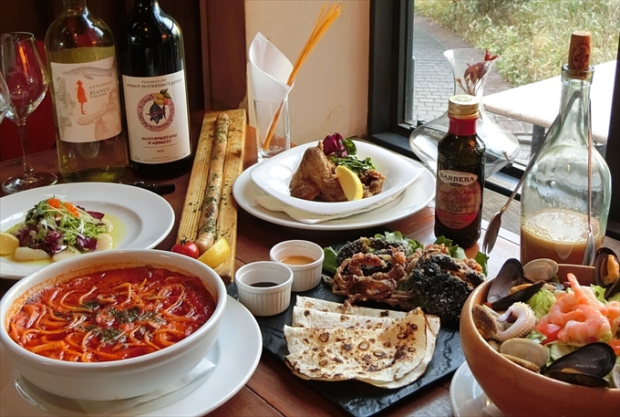 上野で人気のイタリアン。店内は天井が吹き抜けのように高く開放感があり、内装の赤とギンガムチェックのクロスで統一された空間はまるで本場イタリアの食堂に来たかのような印象。