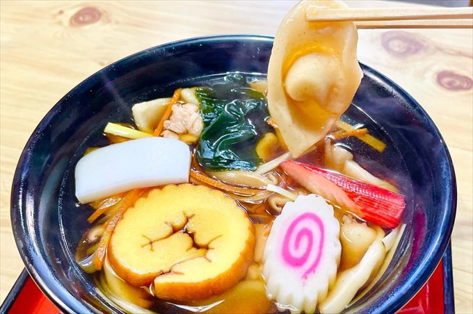 耳うどんは、耳のような形をした大きなうどんが入っており食べ応えたっぷり。もっちりした食感がたまりません。お正月料理らしく、だて巻きやなるとなどがのっていて豪華なのも嬉しいポイントです。