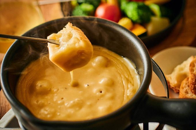 看板メニューは白ワインとブランデーを惜しみなく使用したチーズフォンデュ。グリエールチーズたっぷりのコクでワインがすすんでしまうこと間違いなしです。