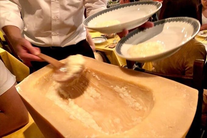 こちらのお店といえば「パルミジャーノチーズリゾット」。大きなチーズを器に見立てたリゾットはインパクト大で誰もが喜ぶスペシャルメニュー。濃厚なチーズの味と香りはクセになる贅沢な美味しさです。